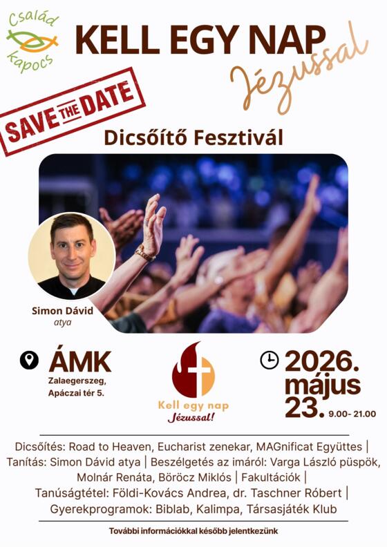 2026. május 23-án, szombaton egész napos dicsőítő fesztivált szervez a Családkapocs Egyesület Kell egy nap Jézussal! címmel a zalaegerszegi ÁMK-ban. A nap meghívott vendégei között szerepel Varga László püspök atya, Simon Dávid atya Sopronból, az Eucharist zenekar, a MAGnificat Együttes és még sokan mások.